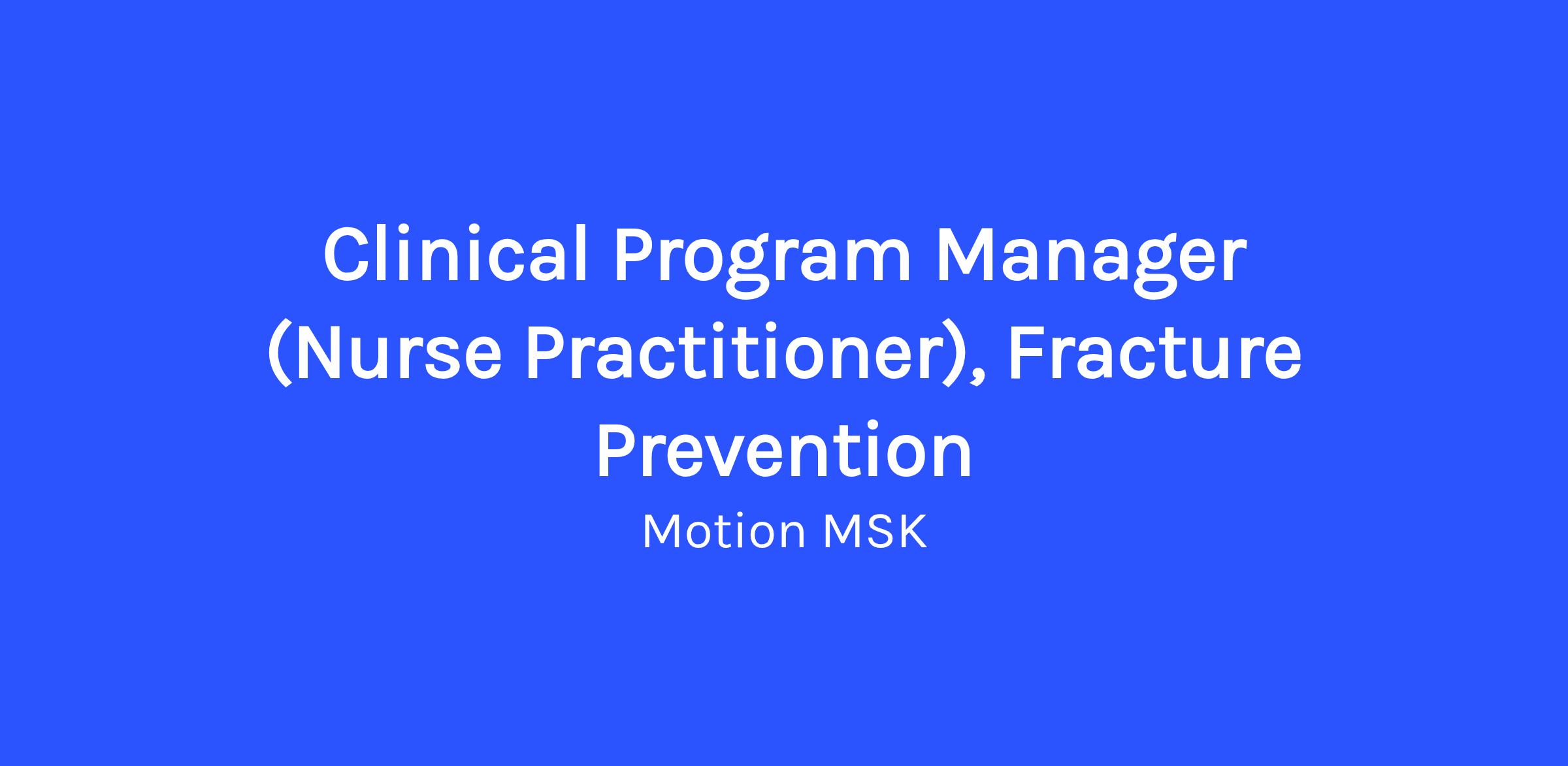We are seeking a Clinical Program Manager (Nurse Practitioner) to serve as the cornerstone of Motion MSK’s Fracture Prevention Program. This program is dedicated to helping patients at risk for fractures by providing timely screenings and follow-up care. This program plays a vital role in ensuring patients receive the attention they need to improve their bone health and reduce future health risks.