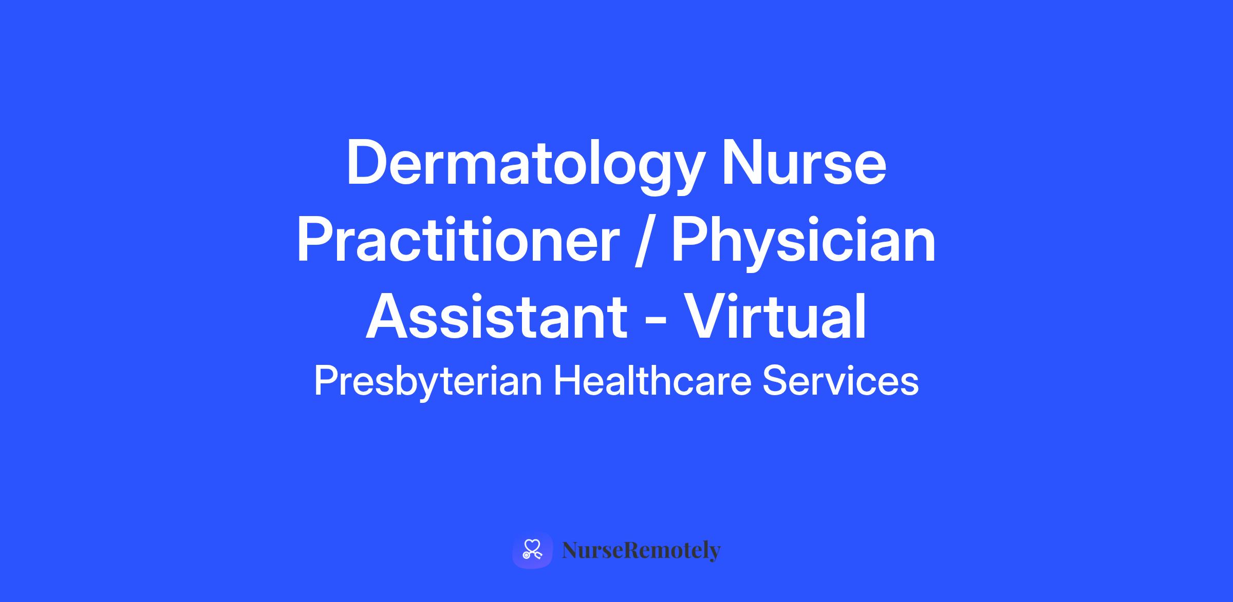 Presbyterian Medical Group seeks a Virtual/Telehealth Nurse Practitioner or Physician Assistant to join our established Dermatology practice. We're all about well-being, starting with yours. We offer a nationally competitive salary with relocation allowance available, CME allowance and fully paid malpractice insurance.