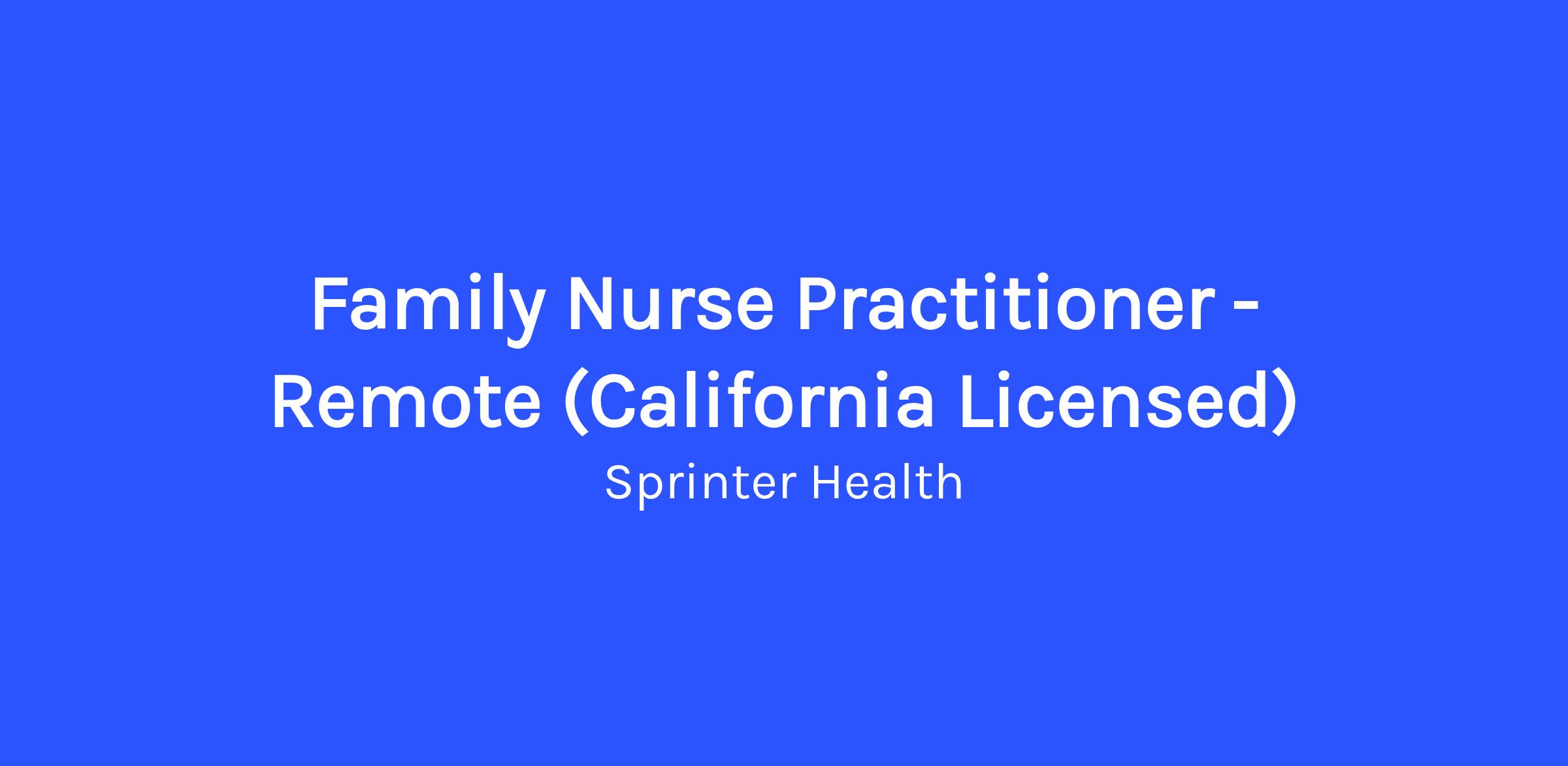 Are you ready to join the pioneering healthcare team at Sprinter Health? We're looking for dynamic Nurse Practitioners who are ready to revolutionize healthcare delivery by conducting virtual wellness visits directly to patients in the comfort of their homes. As a Nurse Practitioner with Sprinter Health, you'll leverage your medical expertise to offer a wide range of healthcare services that could include but not limited to virtual adult and/or pediatric wellness visits, health assessments, and more!