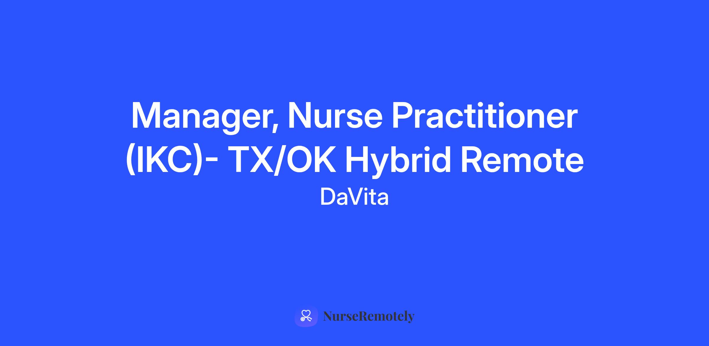11/20/20254405 Ross Ave, Dallas, Texas, 75204, United States of AmericaDaVita is looking for a Full-Time Nurse Practitioner (NP) Manager to join our Care Team in Texas/Oklahoma.