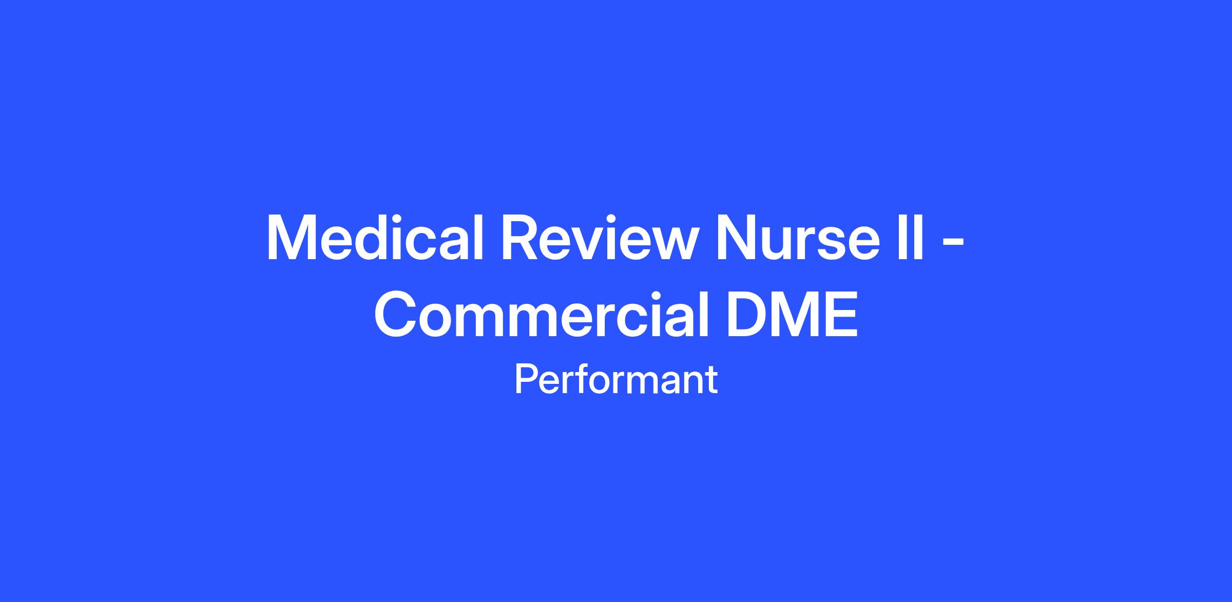 Hiring Range:$69,300 - $78,000The Medical Review Nurse II - Commercial DME primarily performs medical claims audit reviews. As a MR Nurse, you will join a team of experienced medical auditors and coders performing retrospective and prepayment audits on claims for Government and Commercial Payers. You will work remotely in a fast paced and dynamic environment and be part of a multi-location team.