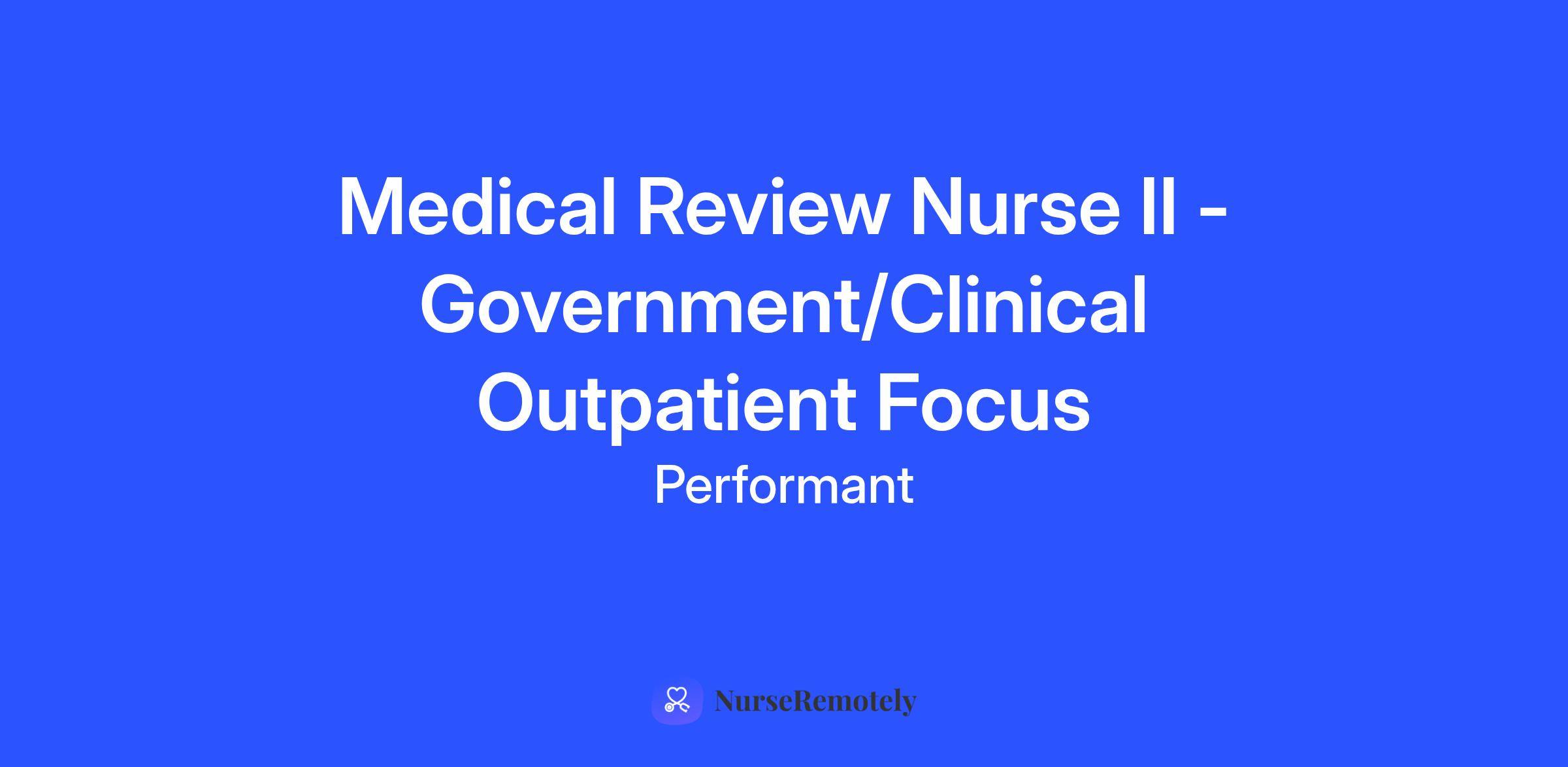 Hiring Range:$69,300 - $78,000The Medical Review Nurse II - Government/Clinical Outpatient Focus primarily performs medical claims audit reviews. As a MR Nurse, you will join a team of experienced medical auditors and coders performing retrospective and prepayment audits on claims for Government and Commercial Payers. You will work remotely in a fast paced and dynamic environment and be part of a multi-location team.