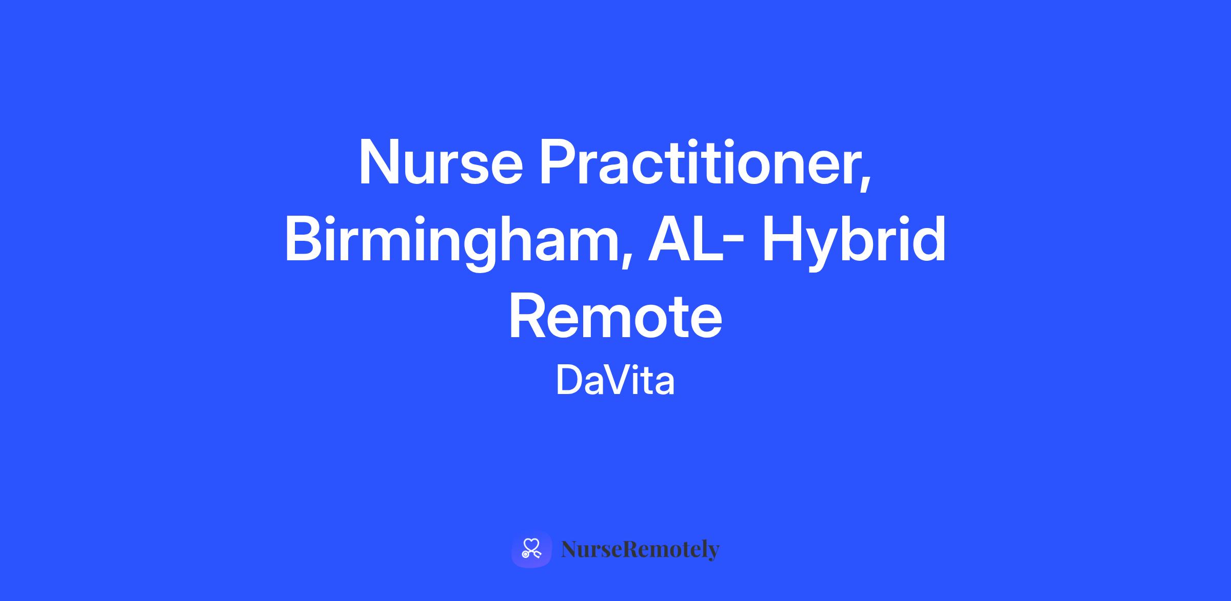10/08/2025300 22nd Street South, Birmingham, Alabama, 35233, United States of AmericaDaVita Integrated Kidney Care (IKC) is looking for a Full-Time Nurse Practitioner (NP) to join us in Birmingham, AL region.