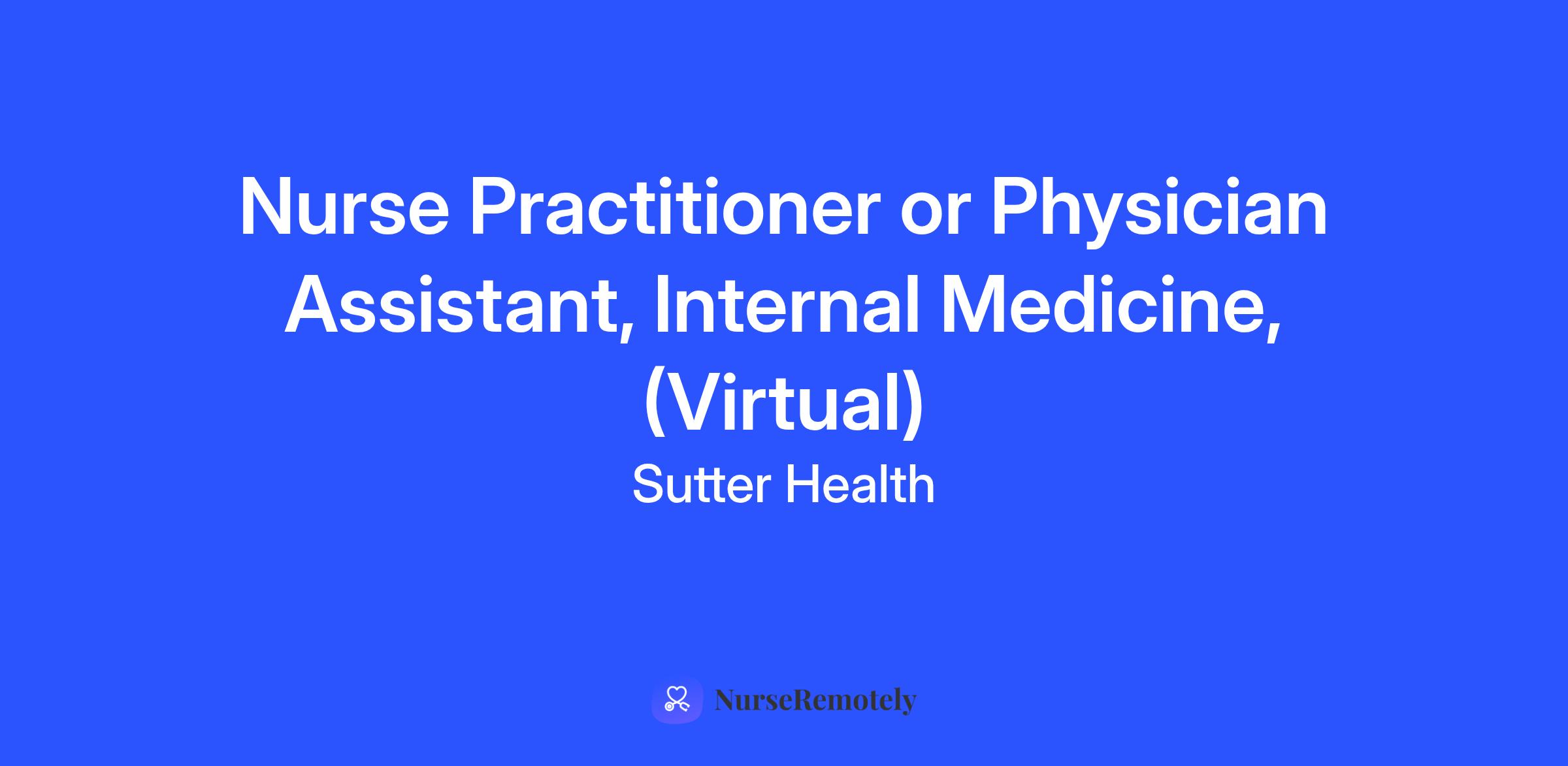 Palo Alto Foundation Medical Group seeks a virtual full-time, certified Nurse Practitioner or Physician Assistant in Internal Medicine