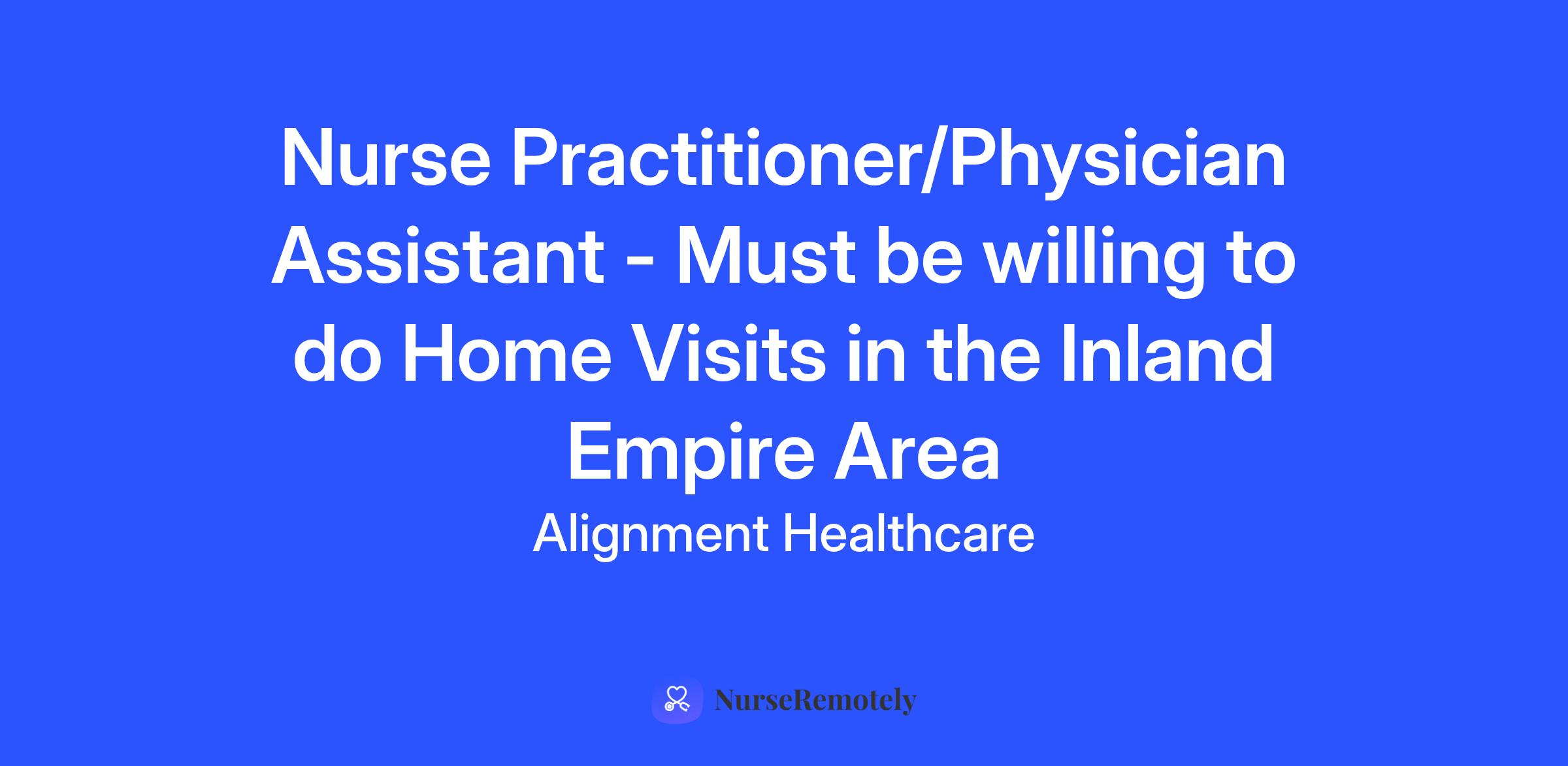 The NP or PA will be apart of the Care Anywhere (CAW) program is designed to provide care and support to our Alignment Healthcare patients by providing an additional level of medical and social support in the comfort of their own home. This program is offered to eligible patients at no cost to them with the goal of preventing unnecessary hospitalizations, health complications, and unmanaged disease progression that can occur when timely clinical interventions are not provided or are not accessible.Responsibilities: This is a M-F position with traditional work hours doing home visits 4 days a week in the Inland Empire Area and working remotely 1 day a week.