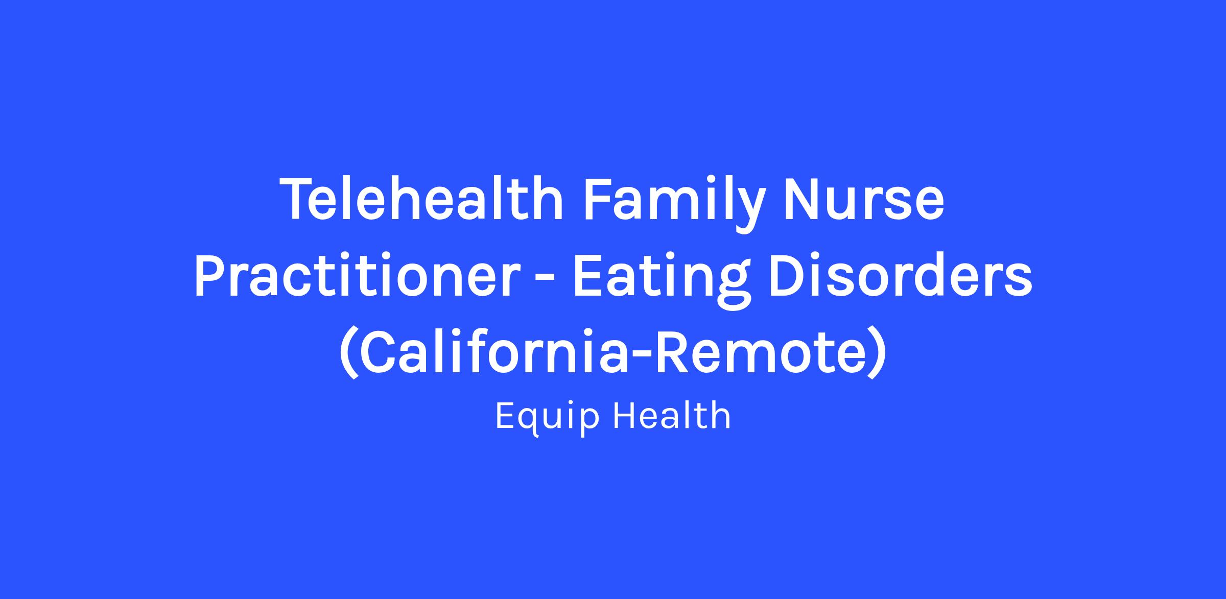 The Family Nurse Practitioner will be responsible for caring for children and adults with eating disorders via Equip’s 100% virtual Telehealth platform. Nurse Practitioners are essential members of Equip's 5-person virtual treatment team, working alongside a therapist, dietitian, peer mentor, and family mentor to help people recover from eating disorders.