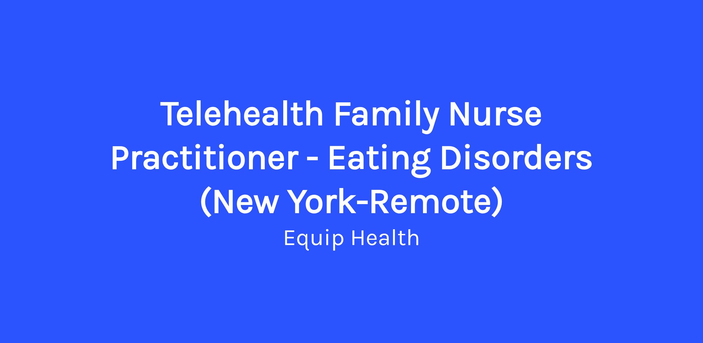 The Family Nurse Practitioner will be responsible for caring for children and adults with eating disorders via Equip’s 100% virtual Telehealth platform. Nurse Practitioners are essential members of Equip's 5-person virtual treatment team, working alongside a therapist, dietitian, peer mentor, and family mentor to help people recover from eating disorders.