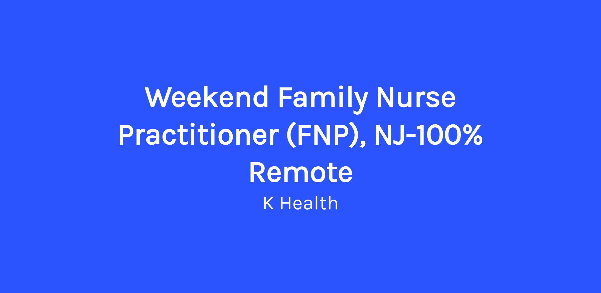 Join K Health as we partner with the nation's top-rated hospital systems to close care gaps by launching completely Virtual Comprehensive Care Clinics. We are seeking a full-time, board-certified Family Nurse Practitioner who will deliver fully remote text and video-based acute care, encompassing preventive care, sick visits, and chronic condition management. The ideal candidate must be licensed in NJ. You will be responsible for maintaining a strong rapport with your patients, representing K Health and our clinical partners, while providing world-class remote care. You are comfortable practicing the full spectrum of comprehensive care, including pediatrics and mental health. Work from the comfort of your home and deliver care to those who need it the most, backed by K Health's cutting-edge clinical-grade AI Platform. Our virtual clinics are fully supported 24/7 by a dedicated team of Care Concierge, Clinical Operations, and technical support staff, which greatly reduces your administrative burden.